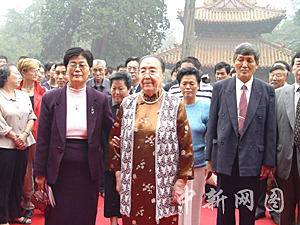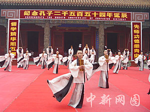 中新網曲阜9月28日電(記者 王魯平 毛公強)幽雅的古樂在空中回蕩,盛裝的少女在翩翩起舞,來自海內外的東方文化崇拜者及孔子的后裔,今天上午在孔子故里曲阜孔廟大成殿前隆重舉行莊嚴肅穆的儀式,紀念孔子誕辰兩千五百五十四年。