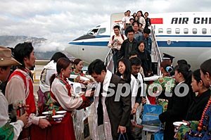 圖:九寨航線通航 藏民為首航游客獻(xiàn)哈達(dá)
