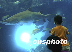 十月黃金旅游假期的海濱大連海洋公園里,母子觀賞水中鯊魚。中新社記者:賈國榮