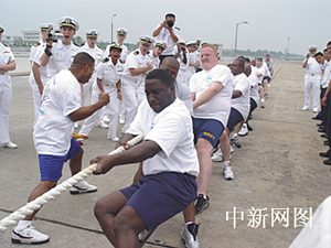 23日,中美海軍首先進行了拔河友誼比賽。拔河比賽應該說是中國海軍水兵的強項,在97年南海艦隊對美洲四國五港的訪問中,中國海軍水兵拔河隊一路上攻城拔寨、未嘗敗績。但這次美國水兵拔河隊是有備而來,且來者不善。15名隊員個個膀大腰圓、粗壯結實,比如,其中一名黑人隊員桑塔納(SANTANA),此人身高199CM,體重250斤,來自美國亞特蘭大,是艦上的武器部門人員。中方隊員與對手相比在塊頭上明顯吃了虧,處于劣勢。比賽開始前,美方隊員圍在一起,大聲鼓勁。比賽開始后,中方水兵拔河隊奮力與對手展開拉鋸戰,雖拼盡全力,無奈實力稍遜一籌,最后不無遺憾地輸掉比賽,美國水兵也算報了上次比賽的一箭之仇。