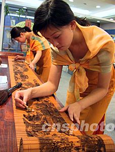 第六屆北京國際藝術(shù)博覽會“十一”黃金周在北京舉行,展出的一萬多件中外藝術(shù)家作品,為北京觀眾節(jié)日文化生活增添了一道亮麗的藝術(shù)風(fēng)景線。圖中展示的是全長3.7米的竹簡雕刻極品《清明上河圖》。中新社記者:張勤