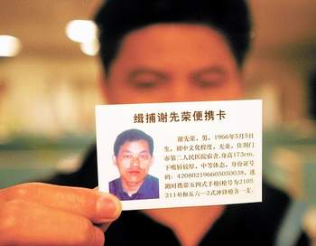 這張卡片名為“緝捕謝先榮便攜卡”,正面左邊為謝先榮的彩色頭像,右邊則是簡介:謝先榮,男,1966年5月5日生,初中文化程度,無業,住荊門市第二人民醫院宿舍,身高173厘米,下嘴唇較厚,中等體態,身份證號碼:420802196605050038,逃跑時攜帶五四式手槍和五六-2式沖鋒槍各一支。