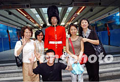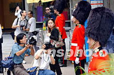 在國慶黃金周之際來香港 “自由行”的內(nèi)地游客,10月6日在中環(huán)鬧市巧遇國泰航空推廣活動(dòng),紛紛把握機(jī)會(huì)與英國衛(wèi)兵合影,顯得興高采烈。作者:統(tǒng)計(jì)員