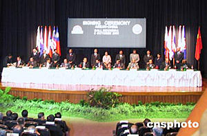 中新網(wǎng)巴厘島10月8日電(記者齊彬)中國(guó)外交部長(zhǎng)李肇星八日在這里與東盟十國(guó)外長(zhǎng)簽署文件,宣布中國(guó)正式加入《東南亞友好合作條約》,從而使中國(guó)成為東南亞地區(qū)以外第一個(gè)加入該條約的大國(guó),中國(guó)國(guó)務(wù)院總理溫家寶與東盟十國(guó)領(lǐng)導(dǎo)人共同出席了簽字儀式。