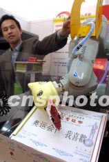 首屆中國租賃業推廣展覽會八日在北京展覽館拉開序幕,來自國內外四十八家企業及制造商云集一堂。北京一家科技有限公司推出可以寫字、拍照、搖獎的智能機器人租賃業務,每日三千元的租賃價格吸引了不少參觀人員。中新社記者:廖文靜