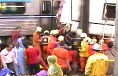 中新網10月14日電臺北縣鶯歌鎮今日上午7時38分傳出火車沖撞載游覽車的意外,游覽車上載了樹林育林高中的高中生,初步已知至少有20多人受到輕傷,已送往醫院救治,現場消防人員還在搶救。