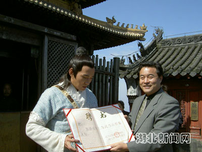 李、焦二人接過聘書說:“一定不辱使命,向中外宣傳武當(dāng)山靈氣,為讓武當(dāng)山連同電視劇《武當(dāng)》走向世界鞠躬盡力!”(郭占柱攝影報(bào)道)