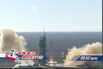 “神舟”五號載人飛船成功發射(1)。(電視截圖)
