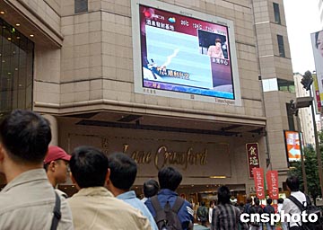 神舟五號飛船十月十五日順利升空,吸引香港市民云集時代廣場觀看電視新聞。中新社記者:潘索菲