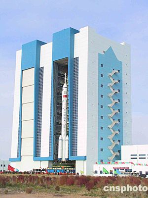 被稱為“亞洲第一門”的酒泉衛星發射中心載人航天發射場總裝測試廠房大門開啟后,“神舟”五號載人飛船船箭塔組合體開始向發射塔架垂直轉運。中新社記者孫自法攝