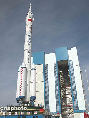 “神舟”五號載人飛船船箭塔組合體轉運途中