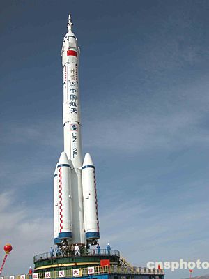 轉運途中的“神舟”五號載人飛船船箭塔組合體直指蒼穹(二)。中新社記者孫自法攝