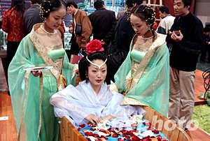10月16日,河南省鄭州房地產(chǎn)交易會上,一房地產(chǎn)商擺出一個沐浴木桶,一個唐朝打份的美女身披薄紗坐在木桶內(nèi),蓋上一個水紋裝飾的蓋板,撒上玫瑰花瓣,做出“美女出浴”的造型,吸引與會者的目光。馬健 攝
