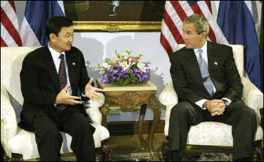 報道稱,布什及夫人勞拉于周六晚些時候到達泰國。在嚴密的保安措施之下,布什與泰國總理他信舉行了會晤。據(jù)其隨從透露,布什將授予泰國“美國在北約外主要盟國”地位,并將給泰國提供一系列的援助,以感激泰國兩月前抓獲了“伊斯蘭團”主要領(lǐng)袖漢巴里和其它的反控努力。