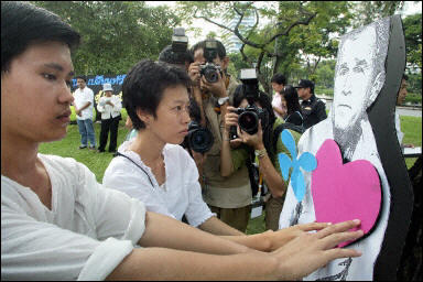 中新網(wǎng)10月19日電 據(jù)法新社報(bào)道,為了反對(duì)美國(guó)與泰國(guó)達(dá)成自由貿(mào)易政策,泰國(guó)農(nóng)民近日舉行示威游行,并用傳統(tǒng)的詛咒方式給布什總統(tǒng)“下降頭”,以“抓住”布什的靈魂,并將其沉入河底,希望藉此能永遠(yuǎn)免受其害。