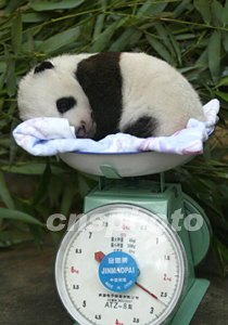 在北京動物園出生五十六天的大熊貓幼崽“甜甜”在媽媽“外出”進食時,睡夢中被飼養員悄悄抱上秤盤,小家伙已經從出生時的150克長到2,600克。中新社記者:任晨鳴