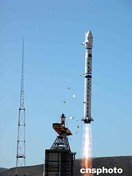中巴地求資源衛星0二星和“創新一號”小衛星二十一日在太原衛星發射中心由“長征四號乙”運載火箭一箭雙星成功發射升空。中新社記者 孫自法 攝