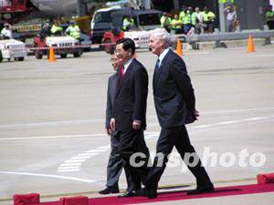 中國國家主席胡錦濤和夫人22日上午10時許抵達悉尼國際機場,對澳大利亞進行國事訪問,受到澳聯邦總督杰弗里和總理霍華德等熱烈歡迎。中新社記者 劉雨生 攝