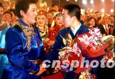 二十四日晚,北京舉行大型文藝晚會《圓夢》慶祝中國首次航天飛行圓滿成功。著名歌唱家德德瑪代表觀眾向航天英雄楊利偉獻(xiàn)花。作者:王玉