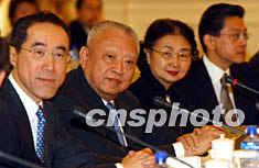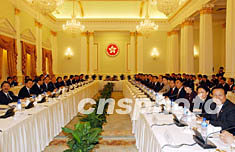十月二十七日,滬港經(jīng)貿(mào)合作會(huì)議在香港禮賓府舉行,圖為香港特別行政區(qū)行政長(zhǎng)官董建華、財(cái)政司司長(zhǎng)唐英年、律政司司長(zhǎng)梁愛詩出席該會(huì)議。中新社記者:潘索菲