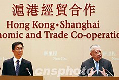 香港特區(qū)行政長官董建華和上海市長韓正,10月27日在香港政府總部會見傳媒,董建華表示,與上海市長韓正討論滬港經(jīng)貿(mào)合作,雙方同意在八個領(lǐng)域加強合作。中新社記者:洪少葵