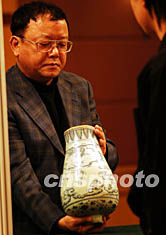 中國(guó)嘉德2003秋季拍賣(mài)會(huì)將于十一月舉行,十月三十日,眾多將拍賣(mài)的文物珍品開(kāi)始在北京進(jìn)行預(yù)展,著名影視演員王剛到現(xiàn)場(chǎng)探察拍賣(mài)品情況并對(duì)一款明清時(shí)代的青花瓷瓶仔細(xì)鑒賞。中新社記者:王麗南
