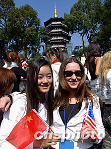 參加新絲路世界模特大賽的中美兩國小姐,十月三十日共同游覽杭州雷峰塔并一起合影留念。中新社記者:賈國榮