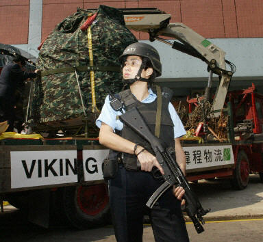 “神舟”五號載人飛船返回艙中午前由飛機運抵香港機場,現正等候送往科學館,準備在航天展展出。圖為香港警察嚴密護衛。