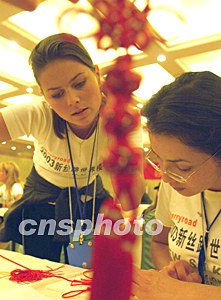 參加中國新絲路世界模特大賽的中外佳麗,十月三十一日在杭州學做中國結。中新社記者:賈國榮