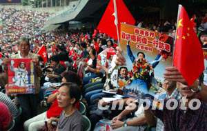 活動組織者滿足了人們的這個愿望。升旗儀式后,楊利偉坐在敞篷車上,繞場一周。人們揮動著手中的國旗、區旗,向他歡呼,向他致敬。