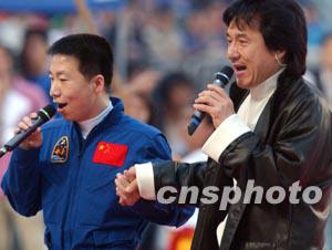中國首位航天員楊利偉與香港明星成龍,周六在香港大球場舉行的歡迎楊利偉大會上演唱歌曲《男兒當自強》。中新社記者:錢興強