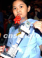 香港中、小學(xué)生與楊利偉及航天科學(xué)家11月3日在香港伊利莎白體育館舉行見面會,一名小學(xué)生向楊利偉送禮品。 中新社記者:錢興強(qiáng)