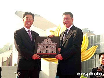 澳門特區行政長官何厚鏵在儀式上向胡世祥贈送紀念品。中新社記者:李剛