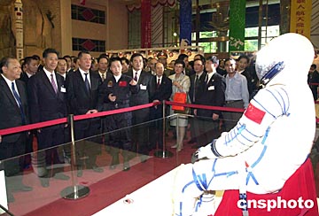 澳門特區行政長官何厚鏵、全國政協副主席馬萬祺、中央駐澳聯絡辦主任白志健等五日參觀澳門特區政府舉辦的「中國首次載人航天飛行展」時聽取楊利偉的介紹。中新社記者:李剛