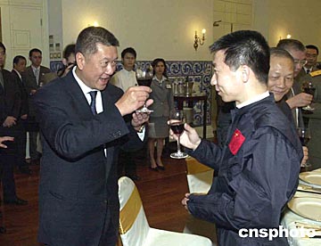 澳門特區政府五日在政府總部舉行歡迎晚宴,歡迎國家首飛航天員楊利偉和中國載人航天代表團訪澳,圖為行政長官何厚鏵在歡迎晚宴上向楊利偉祝酒。中新社記者:李剛
