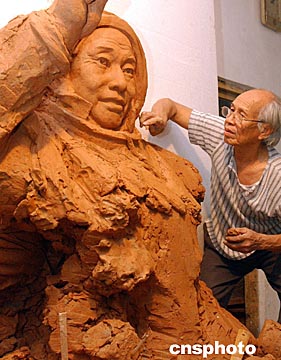 中國著名雕塑藝術(shù)家曹崇恩,近日正在為中國首次乘載人飛船登上太空的航天員楊利偉塑像,該像落成后將作為愛國主義教育作品展立在廣州曹崇恩雕塑園。圖為七十三歲的曹崇恩教授全神貫注為中國首飛太空航天員楊利偉塑像。中新社記者:錢興強(qiáng)