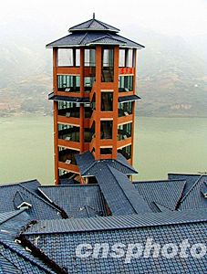 重慶市奉節(jié)縣移民新城在整體建設上重視繼承和發(fā)揚民族文化建筑傳統(tǒng),并于近期在該縣魚腹試驗區(qū)修建了一批古建筑群,集中再現當地獨具特色的民俗文化。圖為已竣工的夔門大酒店“攬月樓”,造型別致,具有土家山寨風格之韻。作者:周會