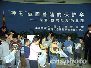 中新社北京十一月九日電(記者孫自法)“‘神舟’五號(hào)飛船返回艙著陸前為什么要用降落傘?”、“降落傘的作用是什么?”……海峽兩岸科普界攜手推出的“中國科技館大自然科學(xué)實(shí)驗(yàn)活動(dòng)”九日以“神舟”五號(hào)返回著陸為切入點(diǎn),讓參與活動(dòng)的小朋友在動(dòng)手實(shí)踐中探索空氣阻力的奧秘。