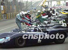 第五十屆澳門格蘭披治大賽車九日進行正式比賽,為讓觀眾重溫大賽車的昔日情懷,金禧杯采用了利曼式起步,圖為賽手各顯神通,飛身上車。中新社記者:李剛