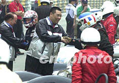 第五十屆澳門格蘭披治大賽車九日進行正式比賽,澳門社會文化司司長崔世安等賽前與參賽車手握手,鼓勵他們賽出好成績。中新社記者:李剛