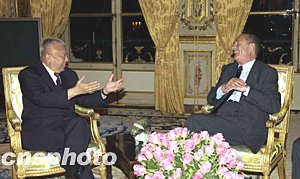 香港特區行政長官董建華十三日(巴黎時間十二日)會見法國總統希拉克(右),向他簡介香港的最新經濟情況。作者:中新社