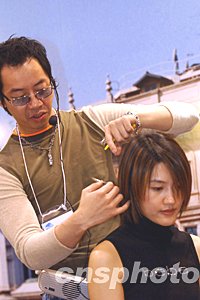 香港發(fā)型設(shè)計師示范入冬流行發(fā)型裝飾。中新社記者:洪少葵