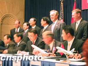 中美采購簽約儀式十二日在美國商務部舉行,中國五家航空公司從美國波音公司采購三十架波音737飛機,價值17億美元,美國商務部長埃文斯(后右二)和中國國家發展與改革委員會副主任張國寶(后右三)等出席簽字儀式。中新社記者:余東暉