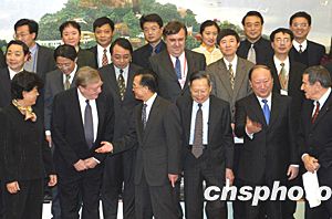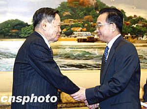 中國國務院總理溫家寶十一月十三日在北京人民大會堂會見美國著名物理學家、諾貝爾獎獲得者楊振寧等前來出席“走向2020年的中國科技——國家中長期科學和技術發展規劃國際論壇”的海外專家。中新社記者:毛建軍