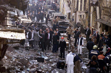 法新社則報道,在出事的畢宇格魯地區,被炸的“Neve Shalom”猶太教堂的墻面遭炸后大片塌落,兩具尸體躺在教堂前,身上蓋著紙,附近留著血。附近一名作坊工人稱,爆炸聲震耳欲聾。