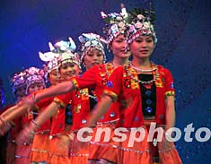 在空軍為中國航天科工集團061基地進行的專場慰問演出中,061基地員工自編自演民族舞蹈《苗家歡歌》(一)。中新社記者 孫自法 攝