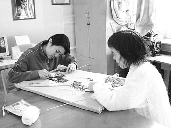 課余時間,老師與有聽力障礙的學(xué)生一起,在做一幅美麗的山水毛線刺繡,她們通過手語進(jìn)行交流,辦公室里安靜而溫馨。