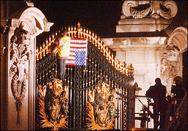 圖:英婦女抗議布什訪英竟攀爬白金漢宮大門