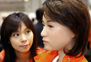 由日本的Kokoro推出的具有人形特征的"Actroid"機器人19日在日本東京舉行的國際機器人大展上揭開面紗。"Actroid"具備有似人表情和人造肌肉。明年Kokoro計劃將1.58米高,30公斤重的"Actroid"投放市場。
