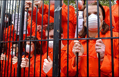 示威者扮成關塔那摩囚犯的模樣進行抗議。